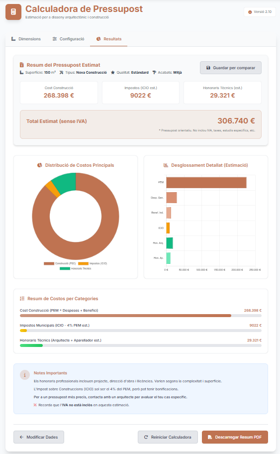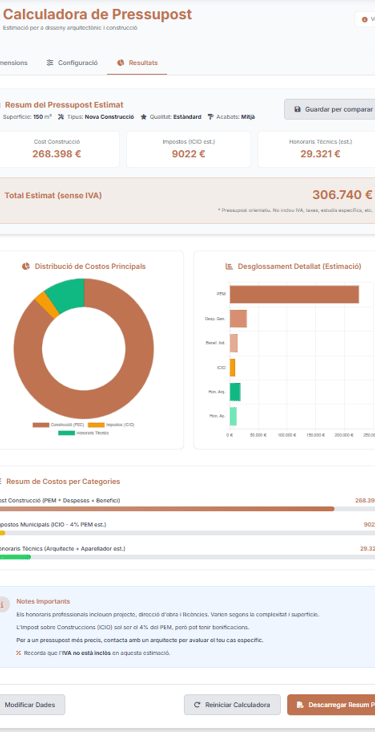 Con la calculadora podrás obtener un presupuesto detallado del total de tu proyecto, coste de construcción, honorarios de los técnicos y coste de permisos de obra.